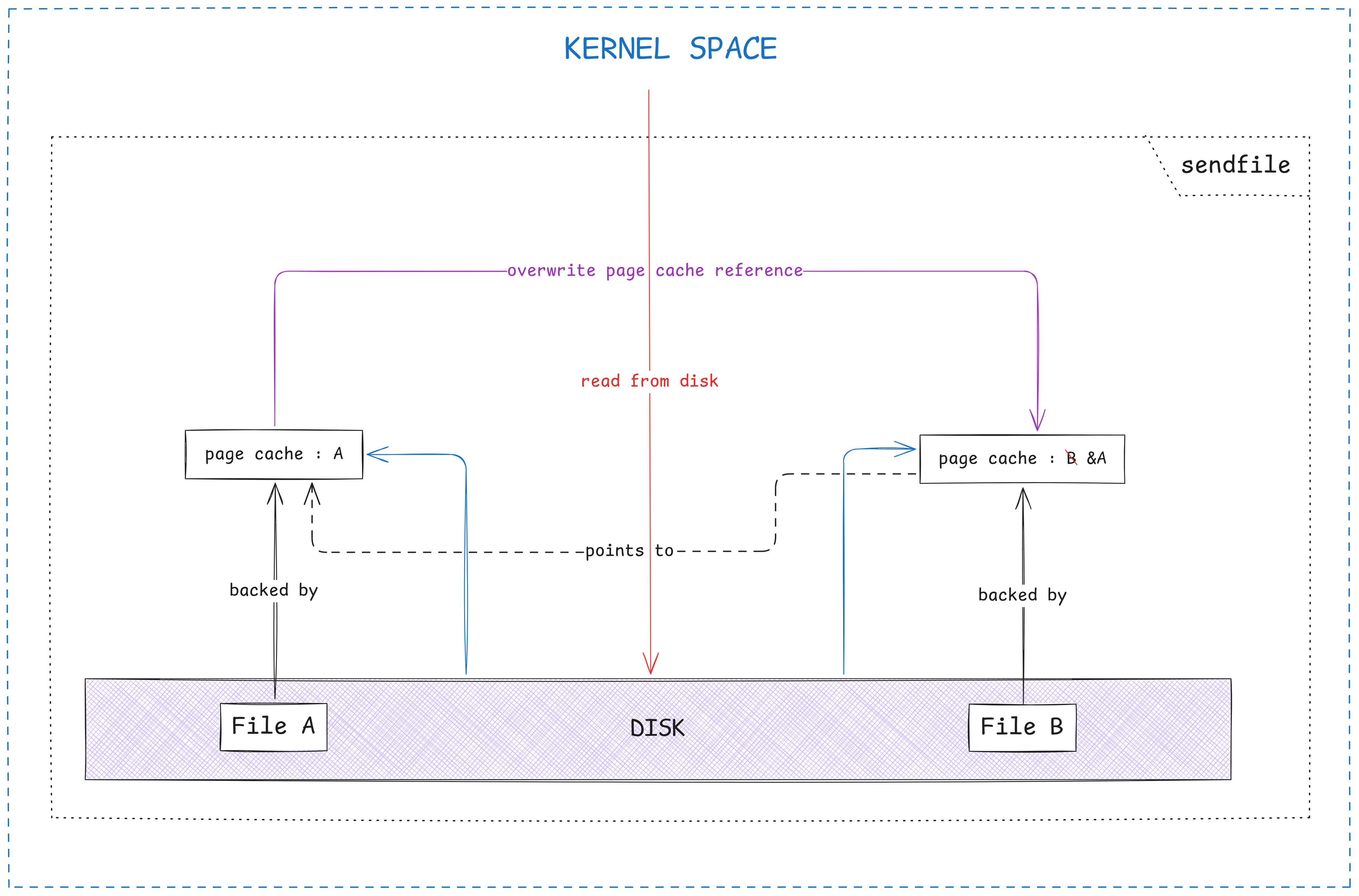 However, there is a major drawback associated with this method. This naive method introduces redundancies and inefficiencies. Since this is a “copy” program, hence, there is no modification of data. This is why it is unnecessary to copy all those bytes from kernel space to userspace and vice versa, wasting memory and useful clock cycles. Along with that, there is practically no need to switch to userspace, only to enter the kernel mode again for the write operation, wasting even more precious CPU time. This is usually solved by using zero-copy system calls like sendfile or splice, which avoids the context-switch to userspace altogether by transferring all bytes within the kernel context. But there is one more bit of redundancy. Since after copying, both, the original and the new files are identical, there is practically no need to copy all bytes again. Instead, only the file’s associated page cache can be changed and a “reference” to the original file’s page cache can be set. This is in fact, a true zero-copy mechanism. Whenever a process needs to “write” to either file, at that time the page cache is lazily “copied” and modifications are made to the new one, hence the name, “Copy-On-Write”.