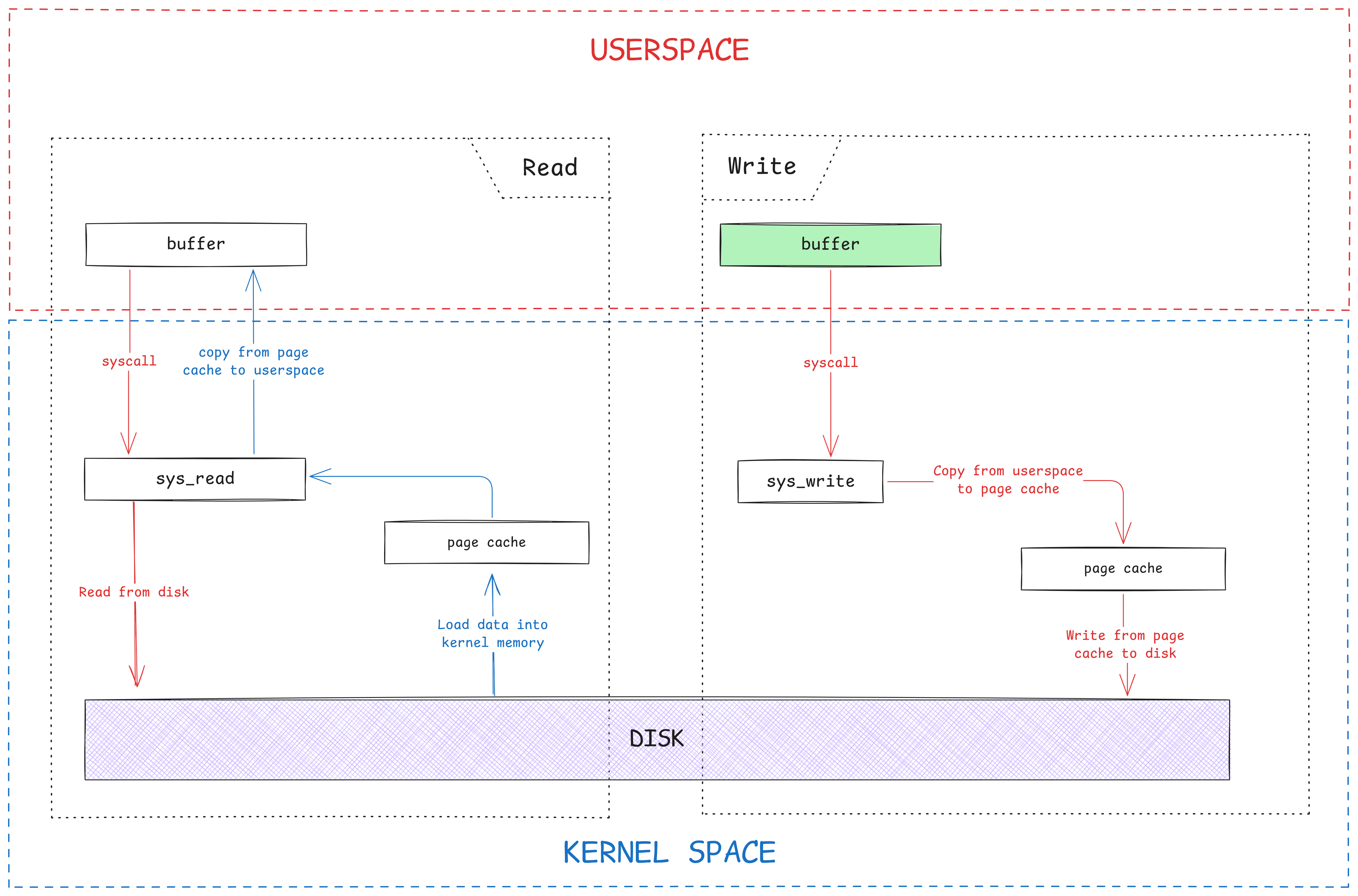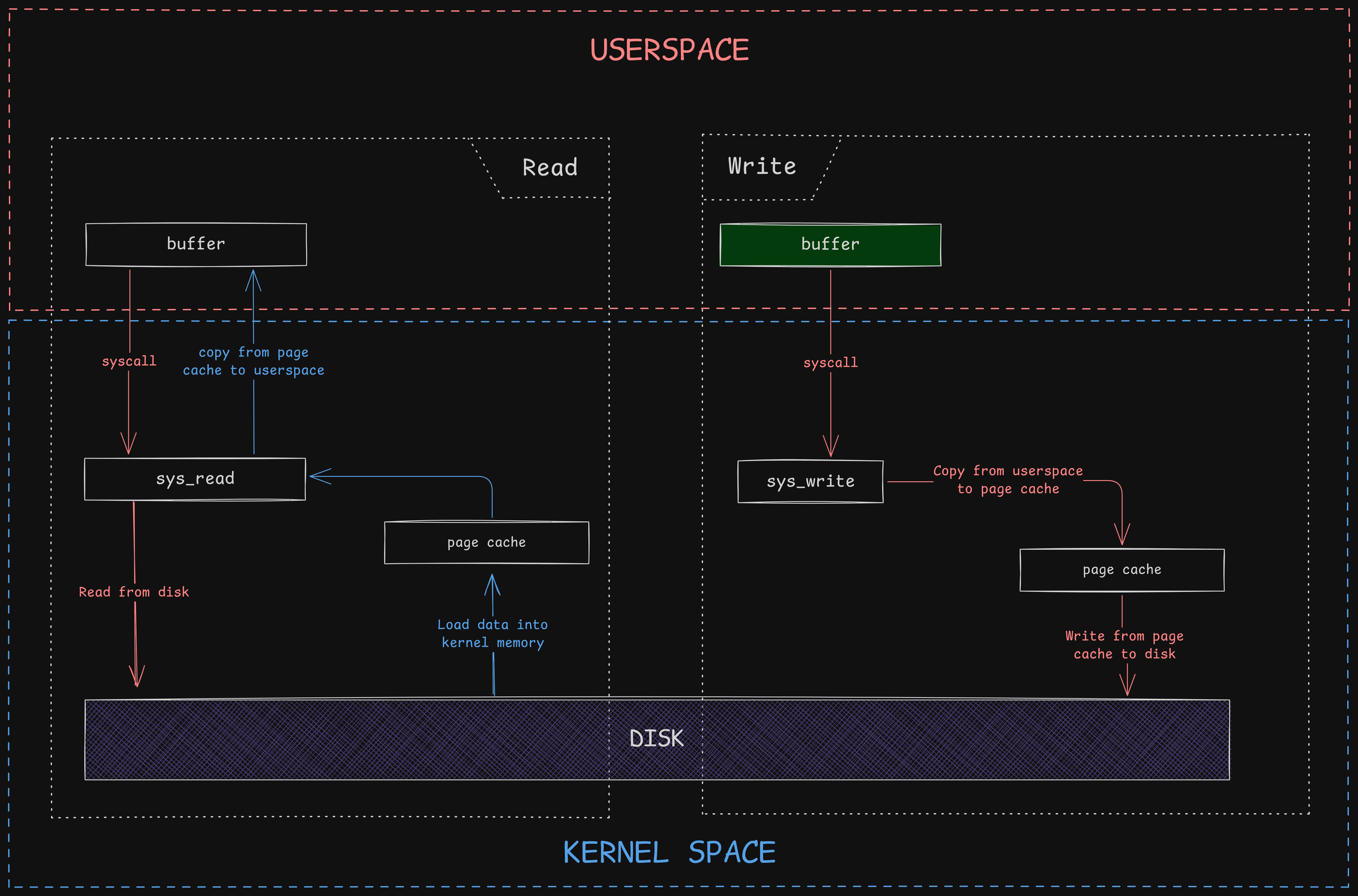 sys_readwhich will grab the file from the disk and load it into an in-kernel memory region known as the page cache. Holding the data in this cache allows for faster access to the filesystem without trying to touch the disk every time. The contents of the page cache are then copied to userspace memory. - Write buffer into another file on disk: Once the buffer is filled in userspace with the file data, we can make another system call like